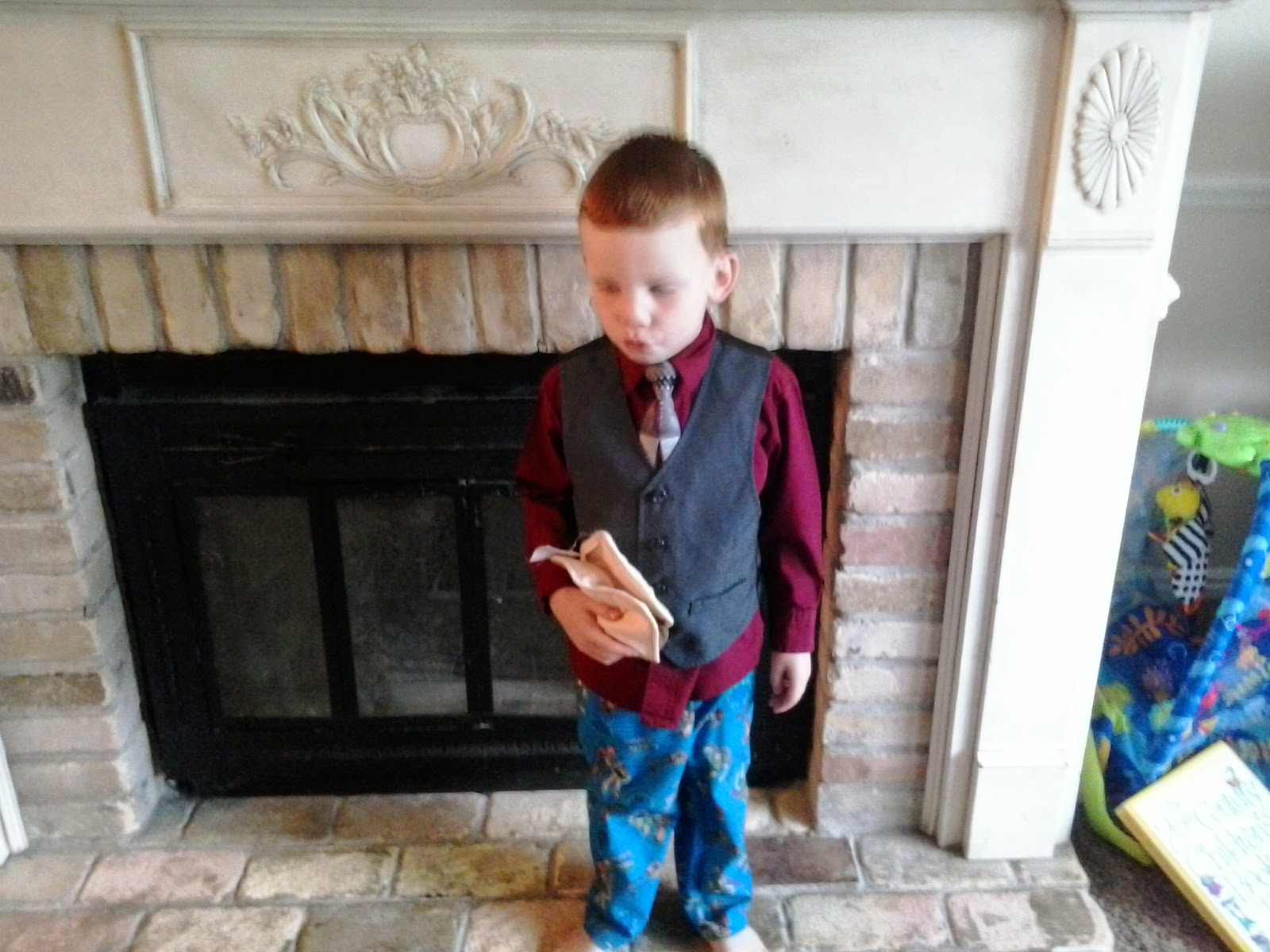 He had a program, but his church pants were at Grandma's house. So we had a good laugh that he was like a news anchor, nice on top, chill below.